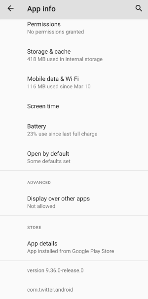 On the same App Info page, the app version is also displayed. One can search the app version on Google to determine whether the version actually exists. If there are lots of search results returned for the version string, then the version probably exists. For example, the above screenshot shows the app com.twitter.android version 9.36.0-release.0 is installed, and searching for "twitter 9.36.0" returns many search results, which indicates that this version is probably legitimate. However, if you see something like "version 100", then the app is probably fake.