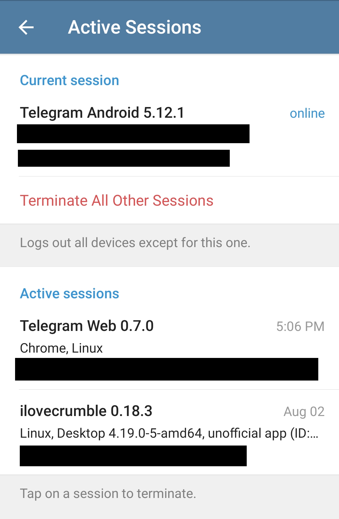 En su aplicación Telegram, vaya a la página Ajustes > Privacidad y seguridad > Sesiones activas. Esta página le muestra todas las sesiones activas que tenga con su cuenta. Puede hacer clic en cualquier sesión para finalizarla.