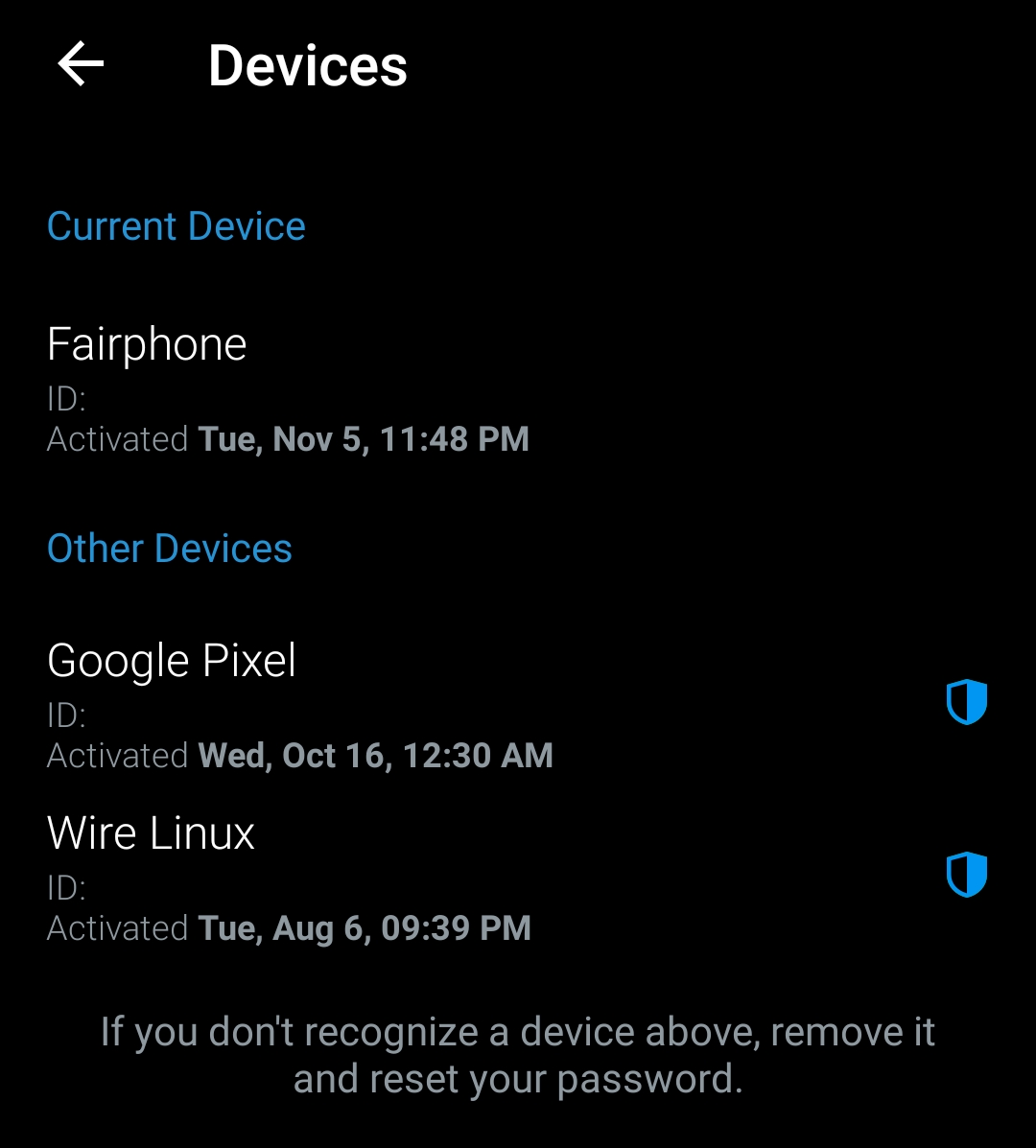 En la aplicación Wire, haga clic en su perfil y vaya a Ajustes > Dispositivos